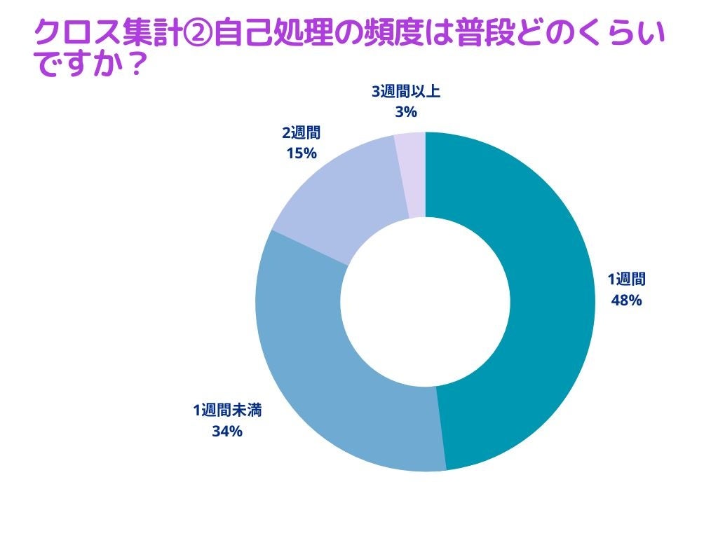 自己処理をする頻度は「1週間(48%)」、「1週間未満(34%)」、「2週間(15%)」、「3週間以上(3%)」ということが分かりました。
