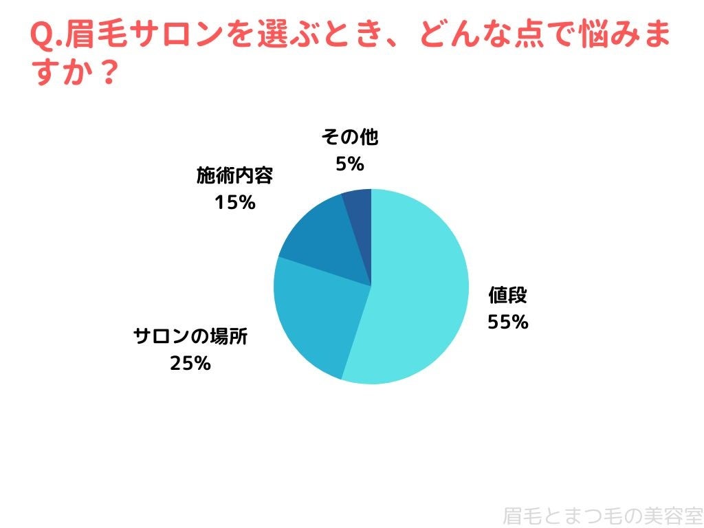 眉毛サロンに行く前に、お店選びで悩むポイントをお聞きしたところ「値段(55%)」が第1位になりました。「サロンの場所(25%)」や「施術内容(15%)」も悩みどころのようです。