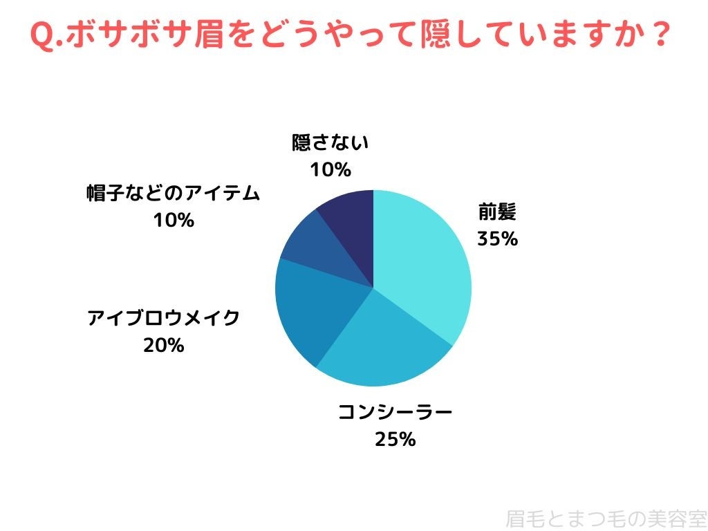 アンケート結果からは、ボサボサ眉はできることなら隠したいという心理があるということが分かります。前髪で見えないようにする隠し方が主流で、それができない人はメイク道具で隠すようにしていました。特にコンシーラーは、肌と眉の境界をボカせるので人気が高いようです。