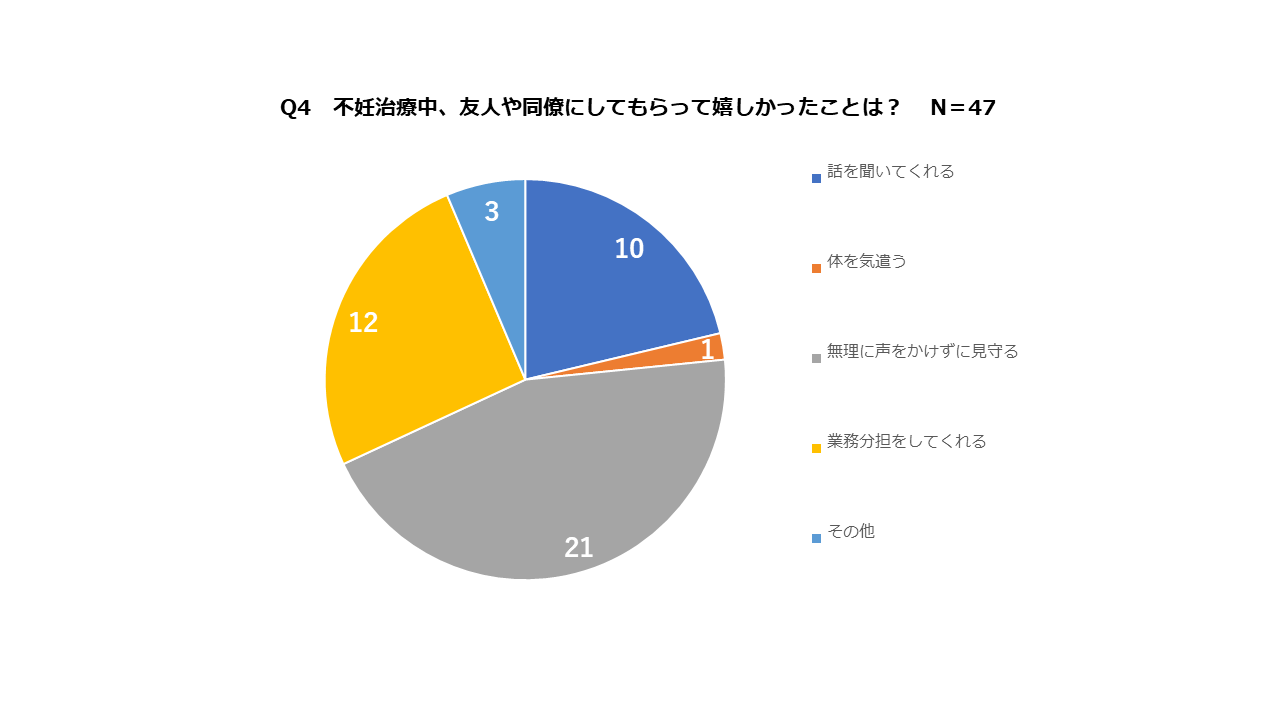 また、『不妊治療中、友人や同僚にしてもらって嬉しかったことは?』という設問に対しては 「無理に声をかけずに見守る」という回答が最も多く、これに対し川崎さんは「『あ、そうなんだ。』と軽く流してくれるくらいが丁度いい。」と、必要以上に心配しないでほしいと語りました。大隅編集長は「ランチや飲み会など、気にせず声をかけてもらえたのが嬉しかったという声もある。」と、普段通り自然に接することで気が楽になる人もいると話しました。