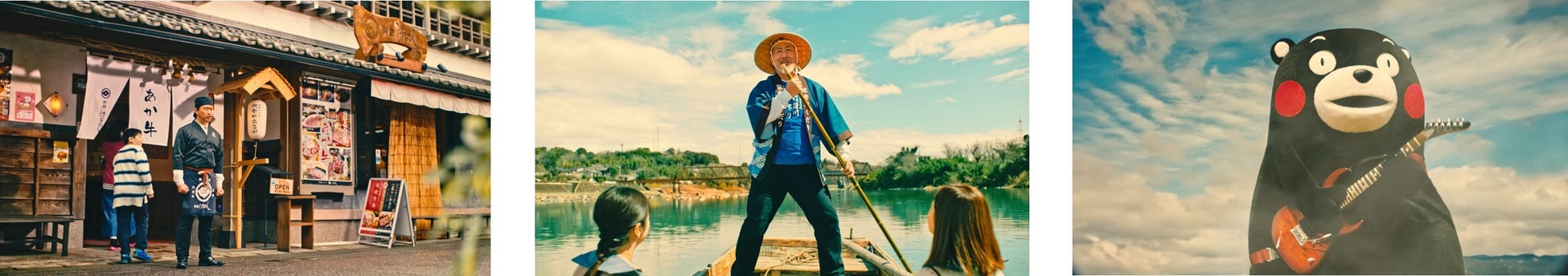 本動画は、1番は阿蘇エリア・2番では人吉エリアを舞台に構成され、阿蘇エリアでは、乗馬体験や雄大な自然の中で楽しむマウンテンバイクを体験する観光客役やご当地グルメ「あか牛丼」の料理人役、また昨年の12月に復旧工事を終えた阿蘇神社を参拝する人役や温泉宿の女将役といったキャストが登場し、観光を楽しむ人の姿はもちろん、観光復興を支えてきた人々の姿を描いています。人吉エリアでは、人吉の観光のシンボルである球磨川や名物の「球磨川くだり」の再開に向け前に進む船頭さんの姿、ご当地グルメ「うな重」の料理人など、球磨川沿いを中心に広がる温泉などの人吉の魅力を、観光復興に向け力強く歩む人々の姿と共に再現しています。