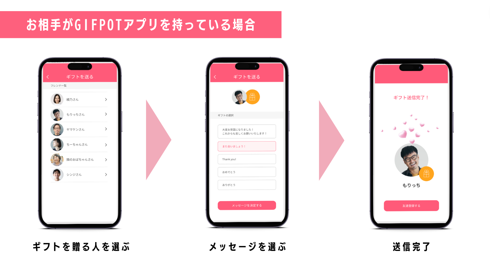 お相手がGIFPOTアプリを持っている場合には、アプリから贈る相手を選んで、