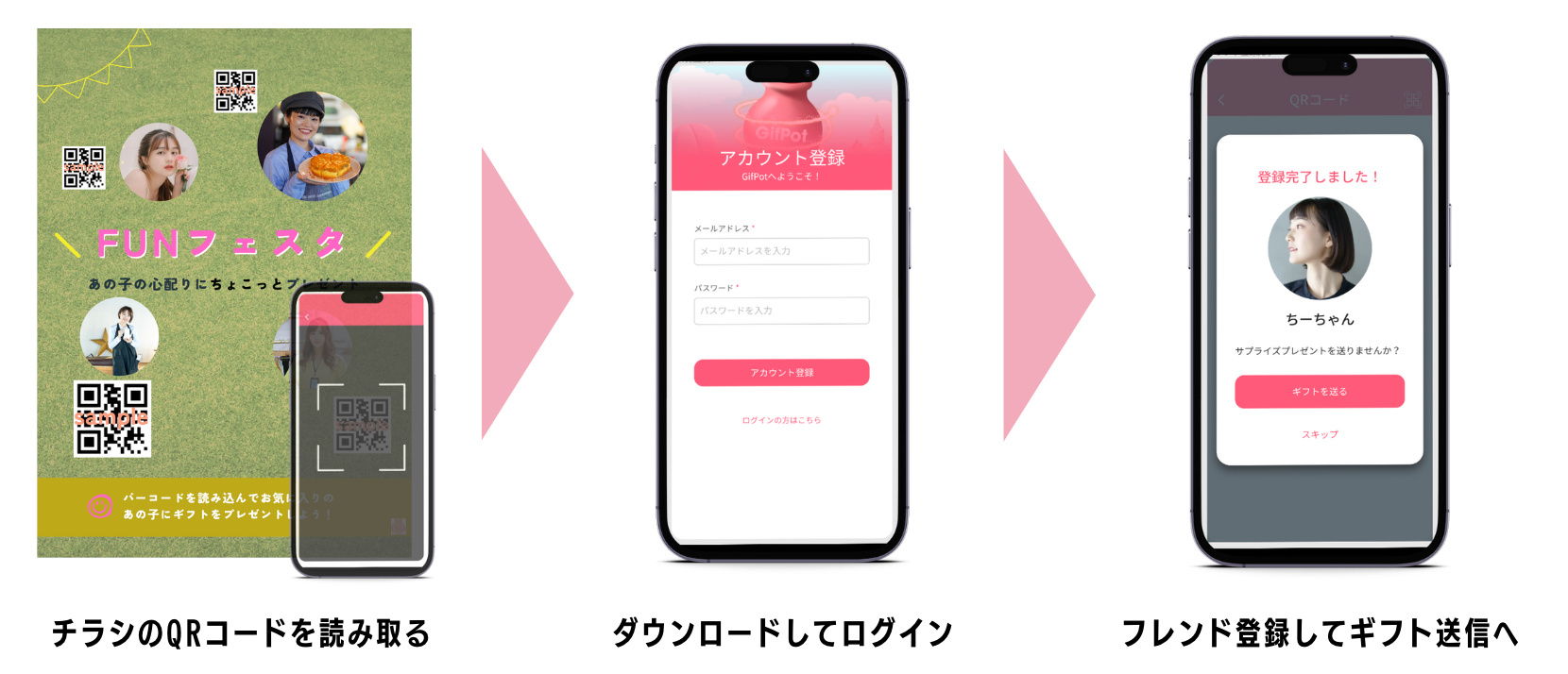 お客様にそのQRコードを読み込んでもらい、「GIFPOT」アプリをダウンロードしてもらうことで、
