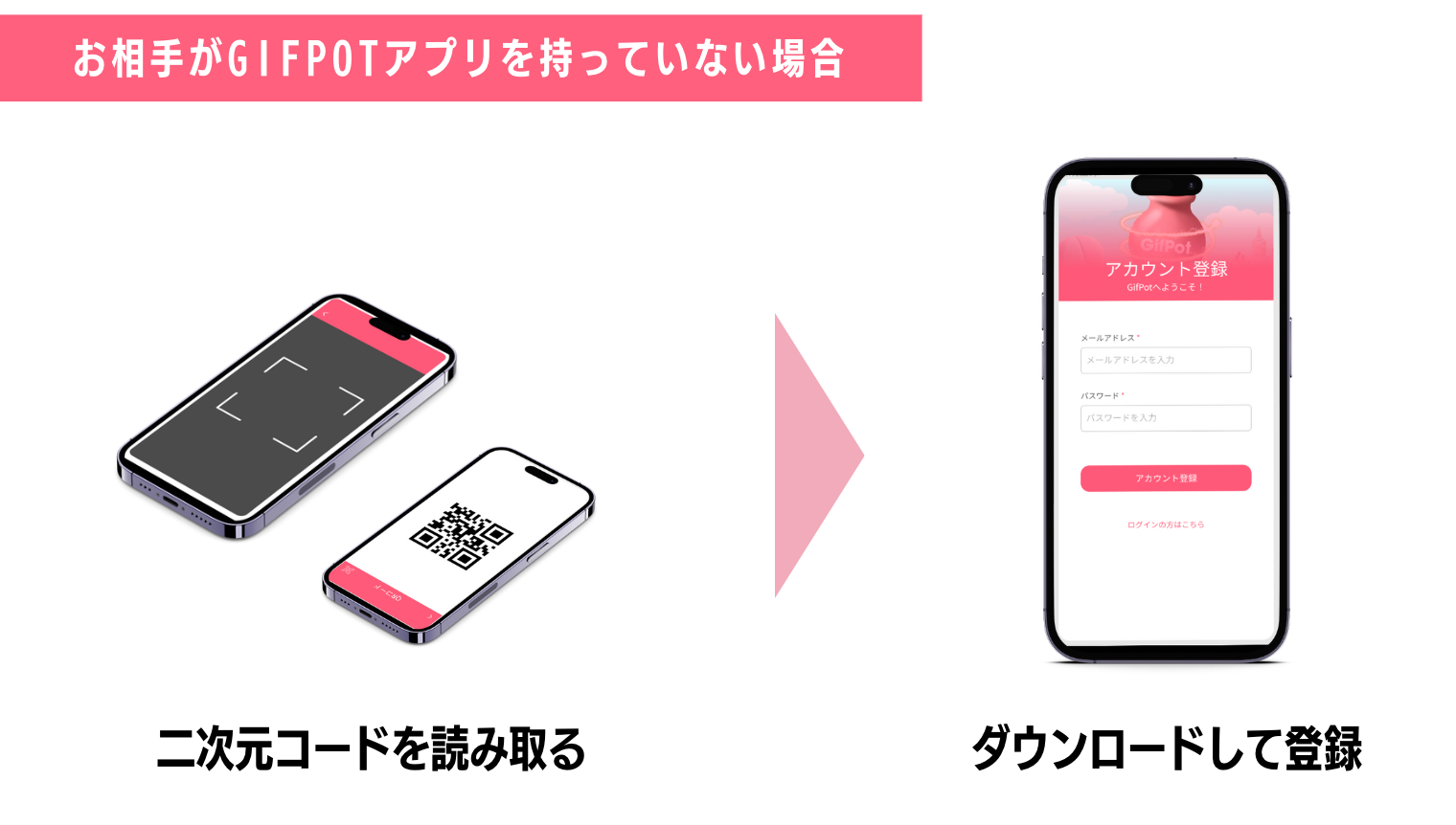 お相手がGIFPOTアプリを持っていない場合は、あなたのGIFPOTアプリから、QRコードを出して、それをスマートフォンで読み取ってもらえばOK!