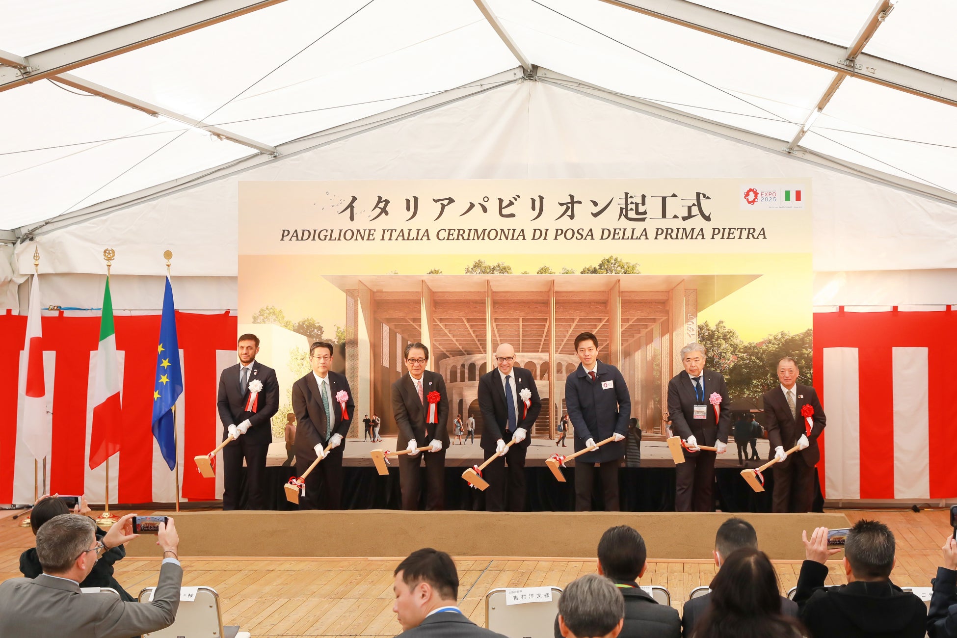 大阪府知事吉村洋文さま、公益社団法人2025年日本万博協会事務総長石毛博行さまなどご来賓からご祝辞を述べていただいたのち、工事関係者も参加して鍬入れが行われました。そして起工式は在大阪イタリア総領事マルコ・プレンチペからご来場者へ感謝を述べた挨拶で閉会となりました。