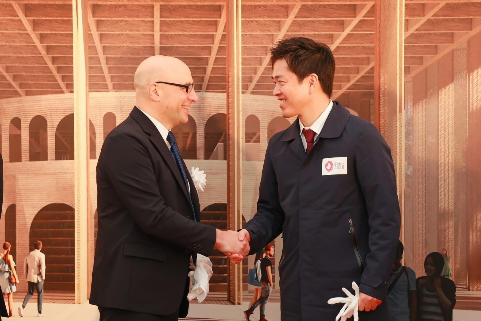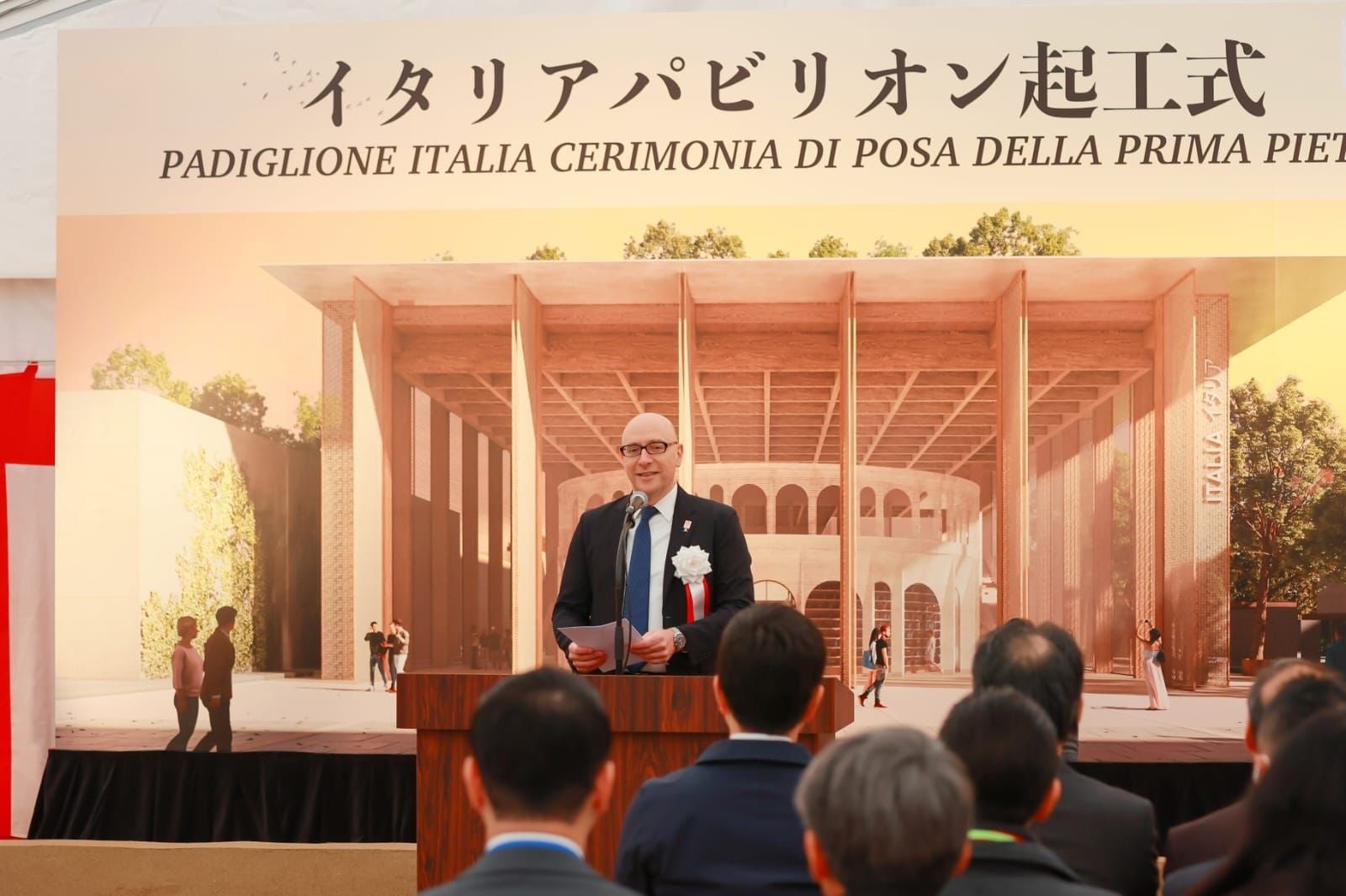 冒頭、施主挨拶において、2025年大阪・関西万博イタリアパビリオン政府代表 マリオ・ヴァッターニは「2025年の万博のテーマ“命かがやく未来社会のデザイン”は素晴らしいプロジェクトだと思います。すべてのプロジェクトは建設現場から始まります。まさにここがその場所です。建設、計画、デザインは、古くからイタリアのDNAに入っていると思います。古代ローマからルネサンス、そして20世紀の偉大な建築作品まで繋がっているものです。