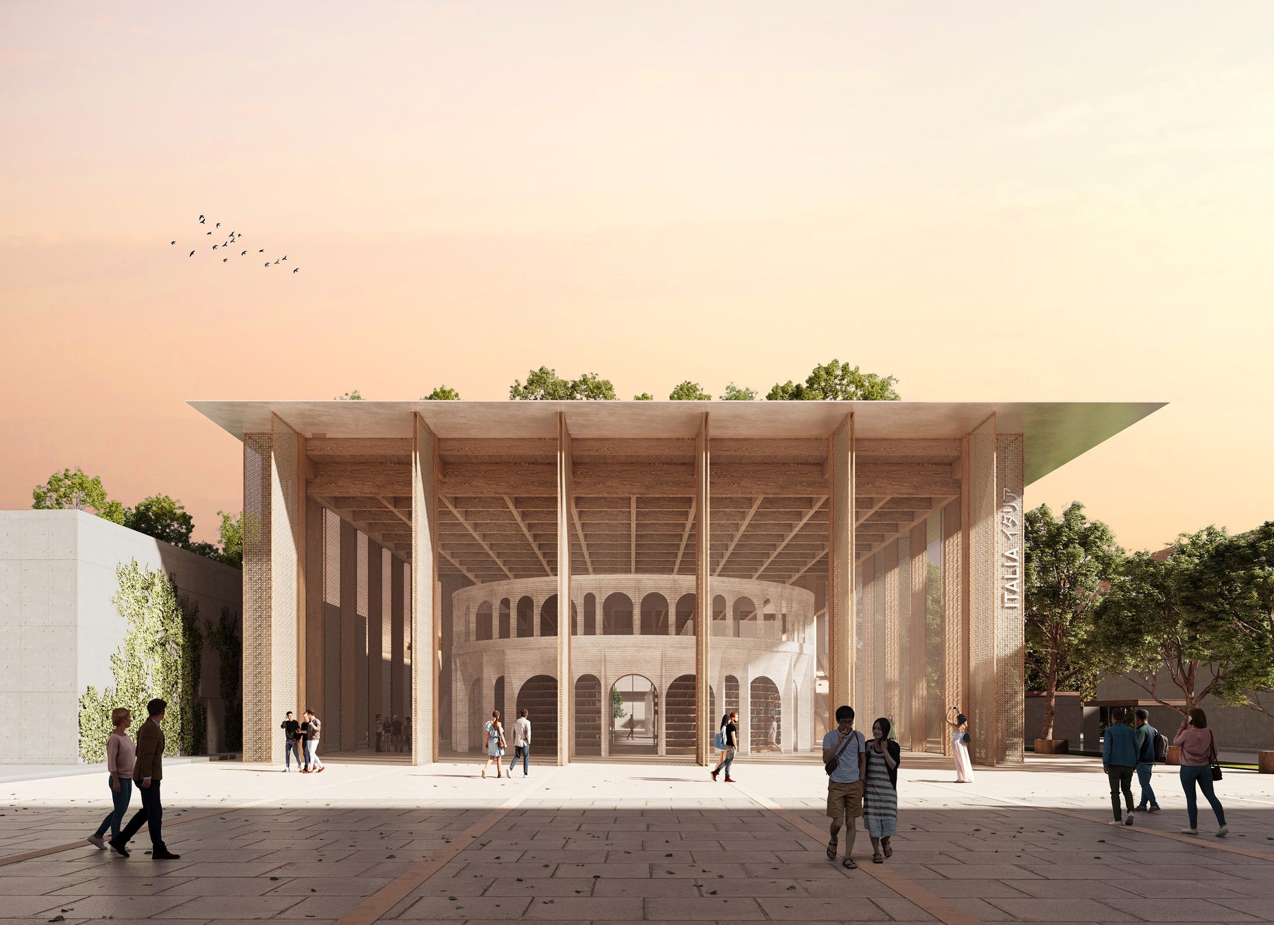 パビリオンは、様々な時代と文化が影響しあって知識や革新を生み出す有機体と考えるクチネッラは、ピアッツァ(広場)テアトロ(劇場)ジャルディーノ(庭園)という社会空間にスポットライトを当て、イタリアの理想都市を三つの幕で構成しました。屋上部分に設けられるイタリアの庭園は、古典的な迷宮のアイデアを現代的にアレンジしたもので、博覧会会場の大屋根からも見ることが出来るものです。イタリアパビリオンの建築チームを率いるのは、マリオ・クチネッラ・アーキテクト(MCA)で、チームには、日本企業の西尾レントオール株式会社などが参加します。博覧会終了後、イタリアパビリオンは、イタリアワークショップとして再利用されることが計画されています。