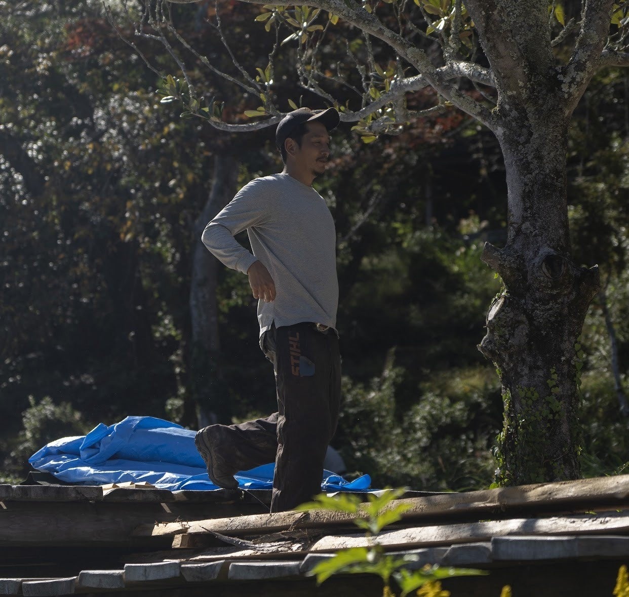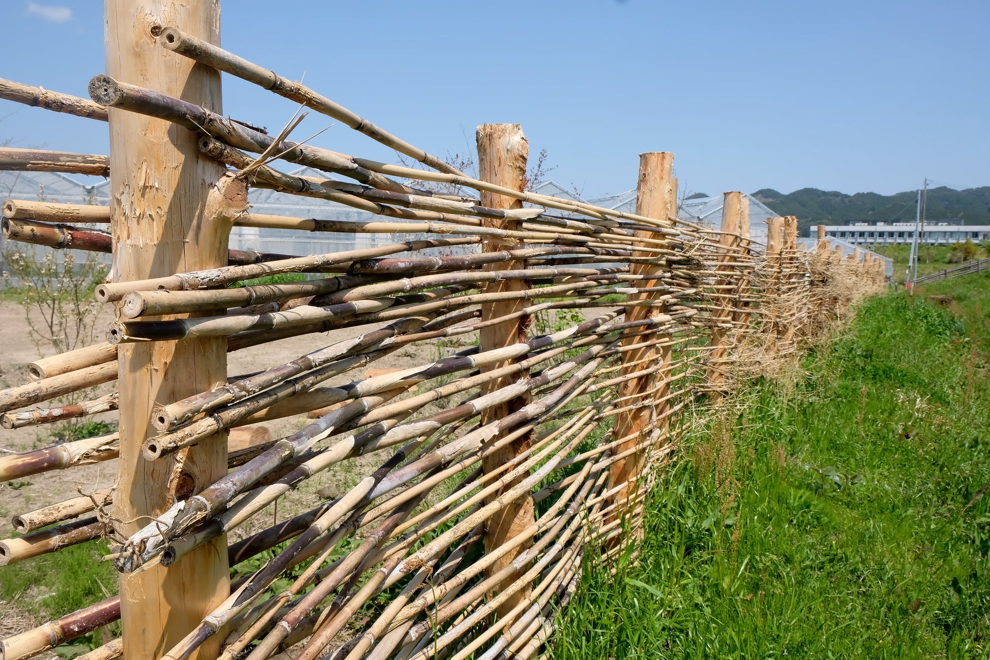 耕作放棄地を藪化している地域の篠竹を活用し、地元杉材の杭の間を篠竹で縫うように囲いました。その数おおよそ3000本。自然の雨や日光、微生物分解により土に近い下部から朽ちていきますが、地域に溢れる竹や間伐材を上からどんどん足していきます。
