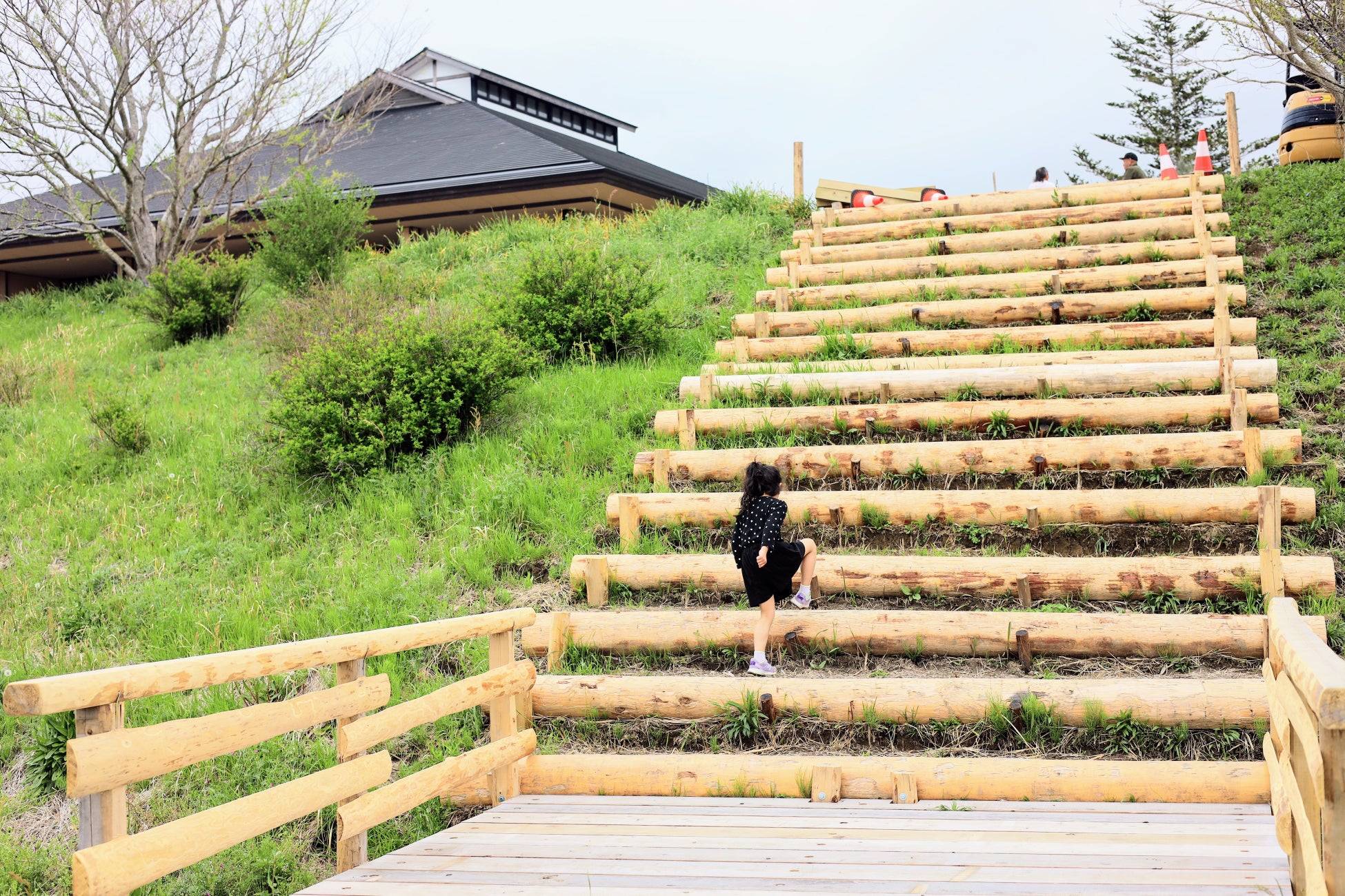 隣接するみんなみの里 第二駐車場から公園をつなぐ横幅4mの地元材の丸太階段は、上るのも下りるのも子供にとっては楽しいアクティビティに変わります。