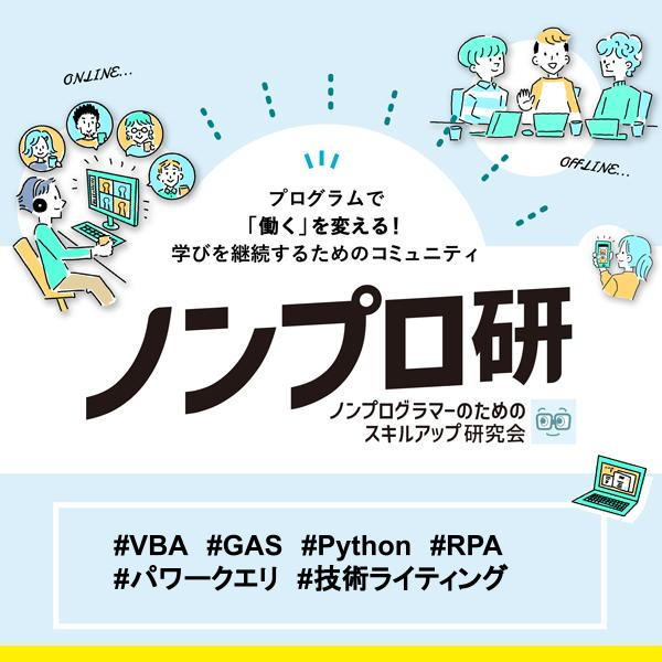 ノンプログラマーのためのスキルアップ研究会とは(ノンプロ研)は、ノンプログラマー(=非IT職のビジネスパーソン)がVBA・GAS・Pythonなどのプログラミングやデジタルスキルを身につけるために、学び合い教え合うための有料月額制オンライン学習コミュニティです。
