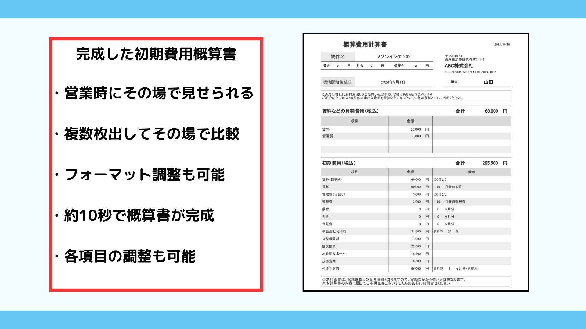 迅速かつ正確な初期費用概算書の提供は、顧客満足度の向上にも直結します。株式会社CIPでの導入事例では、以下の効果が報告されています: