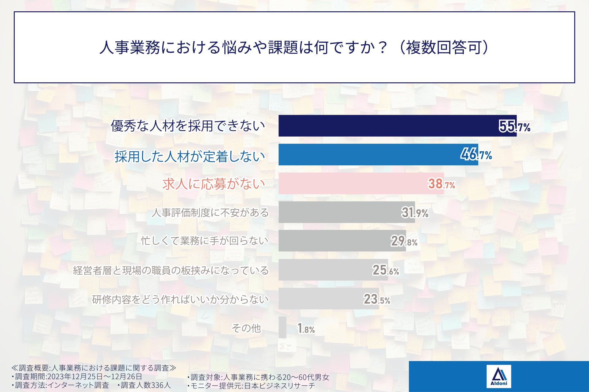 アルドーニ株式会社(本社:東京都中央区、代表取締役:永見 昌彦)は、この度、人事業務担当者336人を対象に、人事業務の悩みや課題および人事業務関連の知識とスキルに関する調査を実施しましたので、お知らせいたします。