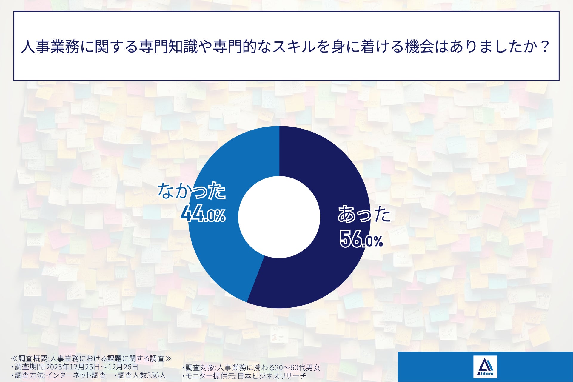 調査の結果、なんと約44%もの人が自分の仕事である人事業務に関する専門知識やスキルを身に付ける機会が「なかった」と回答しました。