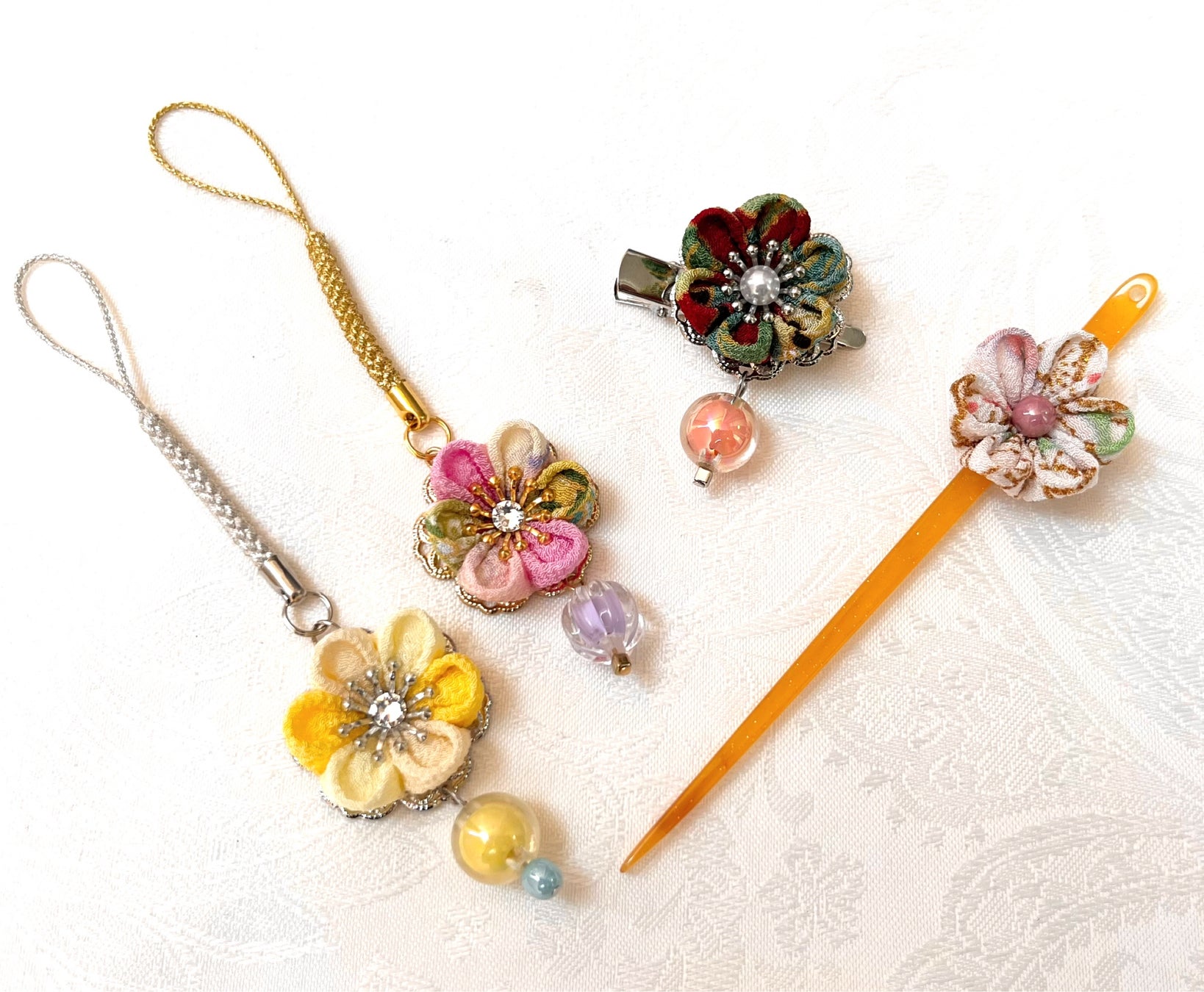 作ったお花はストラップ・クリップ付きブローチ・ミニかんざしに仕立てます。
