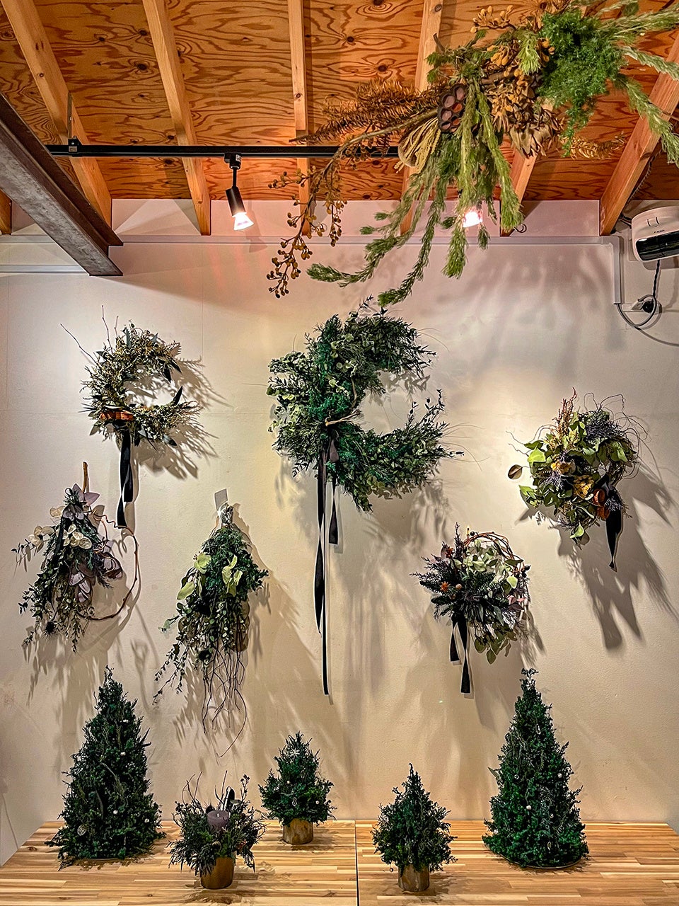 2階ギャラリーにはクリスマスリースやスワッグ、ツリーが展示され