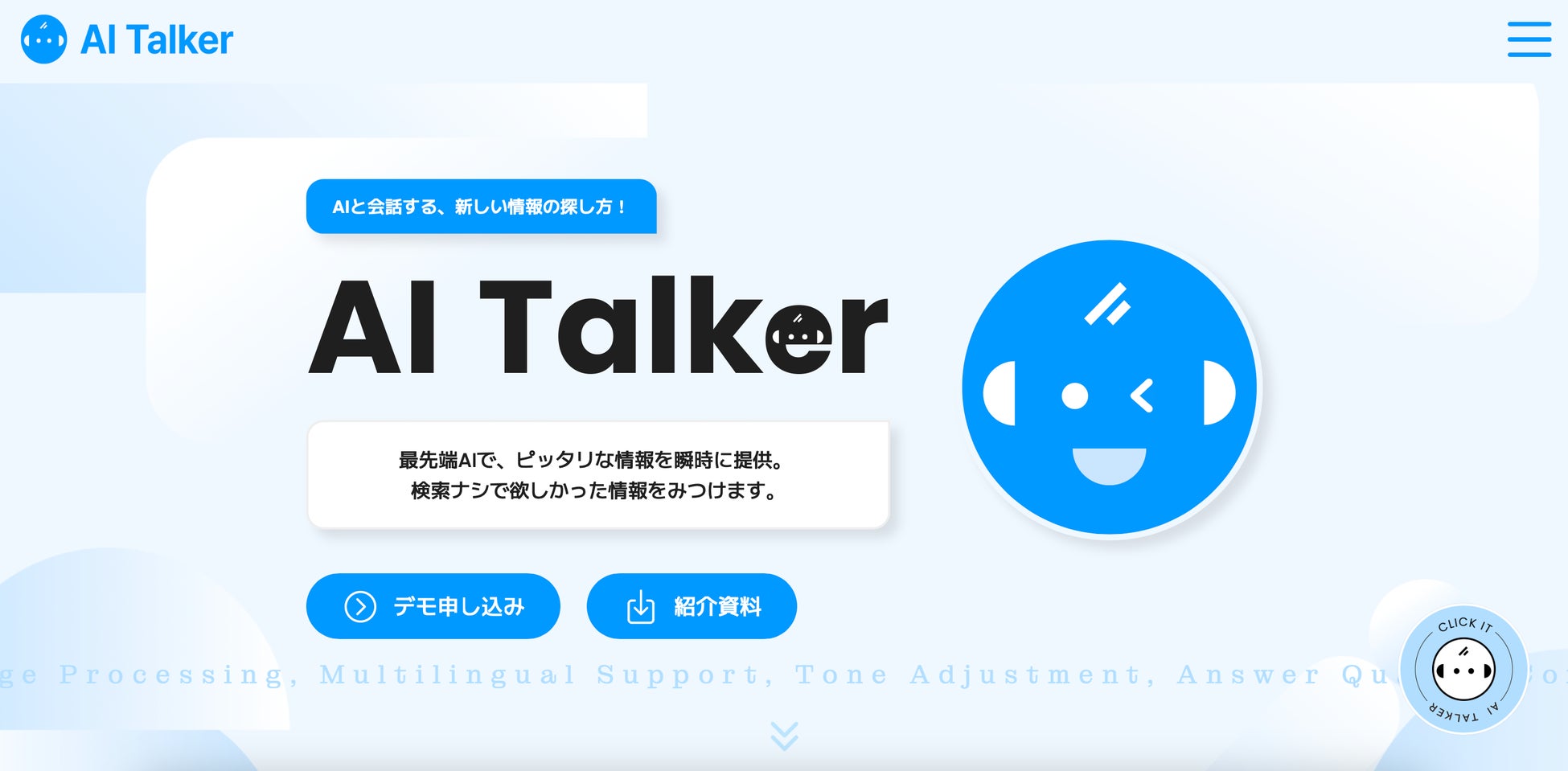 AI Talkerは、ユーザーが複雑な質問を入力すると、迅速かつ的確な回答を提供します。観光案内、教育支援、ビジネスチャットボットとしての用途まで、幅広い場面で活用されており、自然で滑らかな応答を実現しています。