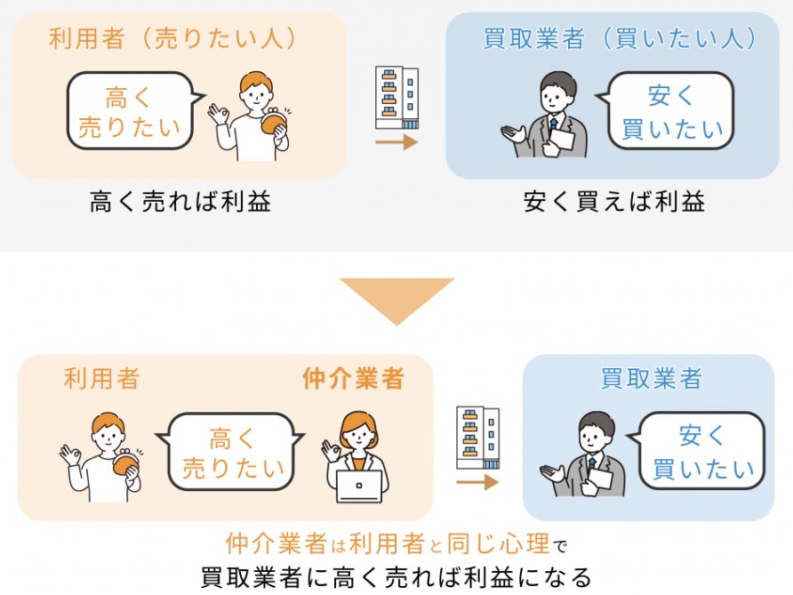 買取業者ではなく仲介業者をご紹介するのは、物件を売りたいオーナー様と同じく「高く売りたい」と考えていることにあります。買取業者は安く買い、高く売却して利益を得ますが、仲介業者の場合は買い主からの売却額に応じた仲介手数料が利益になります。