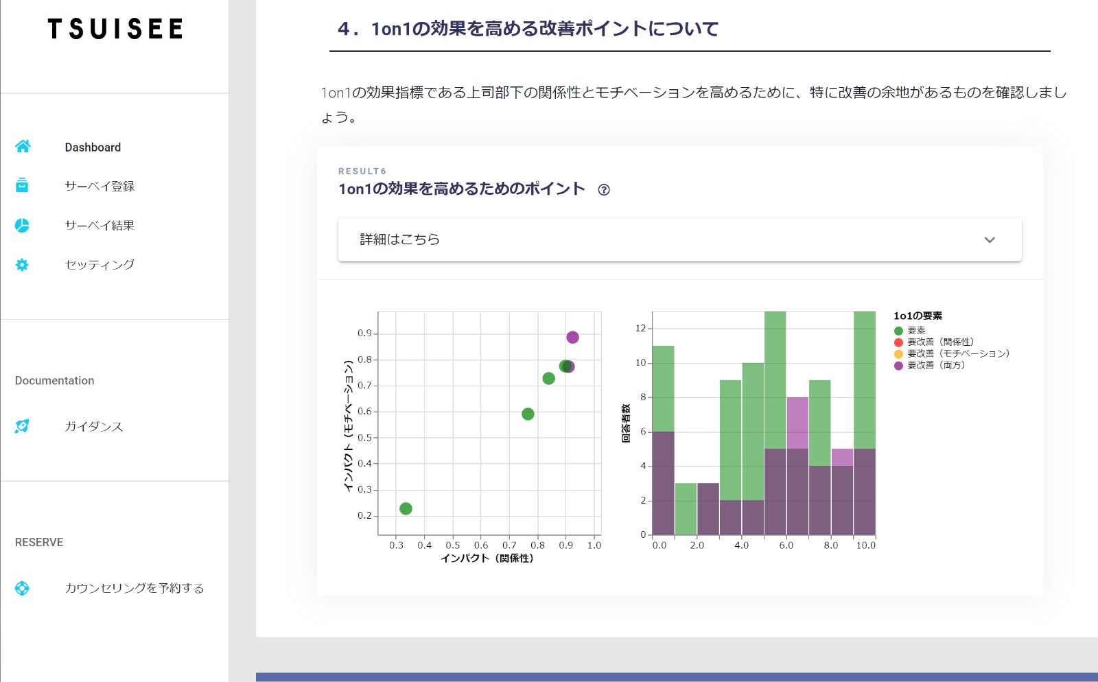 TSUISEEの多様な解析から、こうした介入施策による組織や社員の変化を詳細に測定することが可能になります。そして同時に、組織にとっての有効な介入方法を把握することも可能になります。ベテラン担当者の方の勘や経験、他社の成功事例、HR領域で流行している施策にだけ、助けを求める必要はありません。ご自身の組織がどのような状況であり、その改善のために必要な介入とは一体何か。TSUISEEが表示するものは、効果的な介入方法を科学的に検討するための解析結果です。