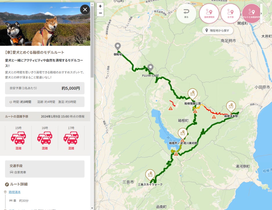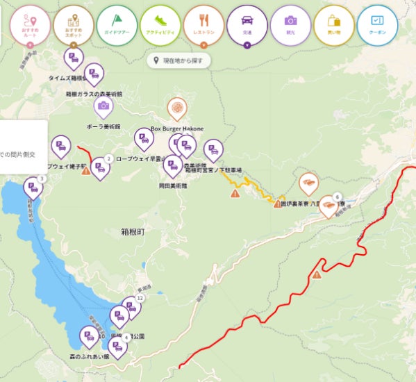 「箱根観光デジタルマップ」は交通や店舗の混雑状況を可視化し、スムーズな周遊をサポートする「店舗・施設の混雑状況発信、予約」「おすすめ周遊ルートの案内」「混雑状況に応じたクーポンの配布」「ガイドツアーの案内、予約」などの機能を盛り込み、「旅マエ」「旅ナカ」での情報発信を行うデジタルマップサービスです。