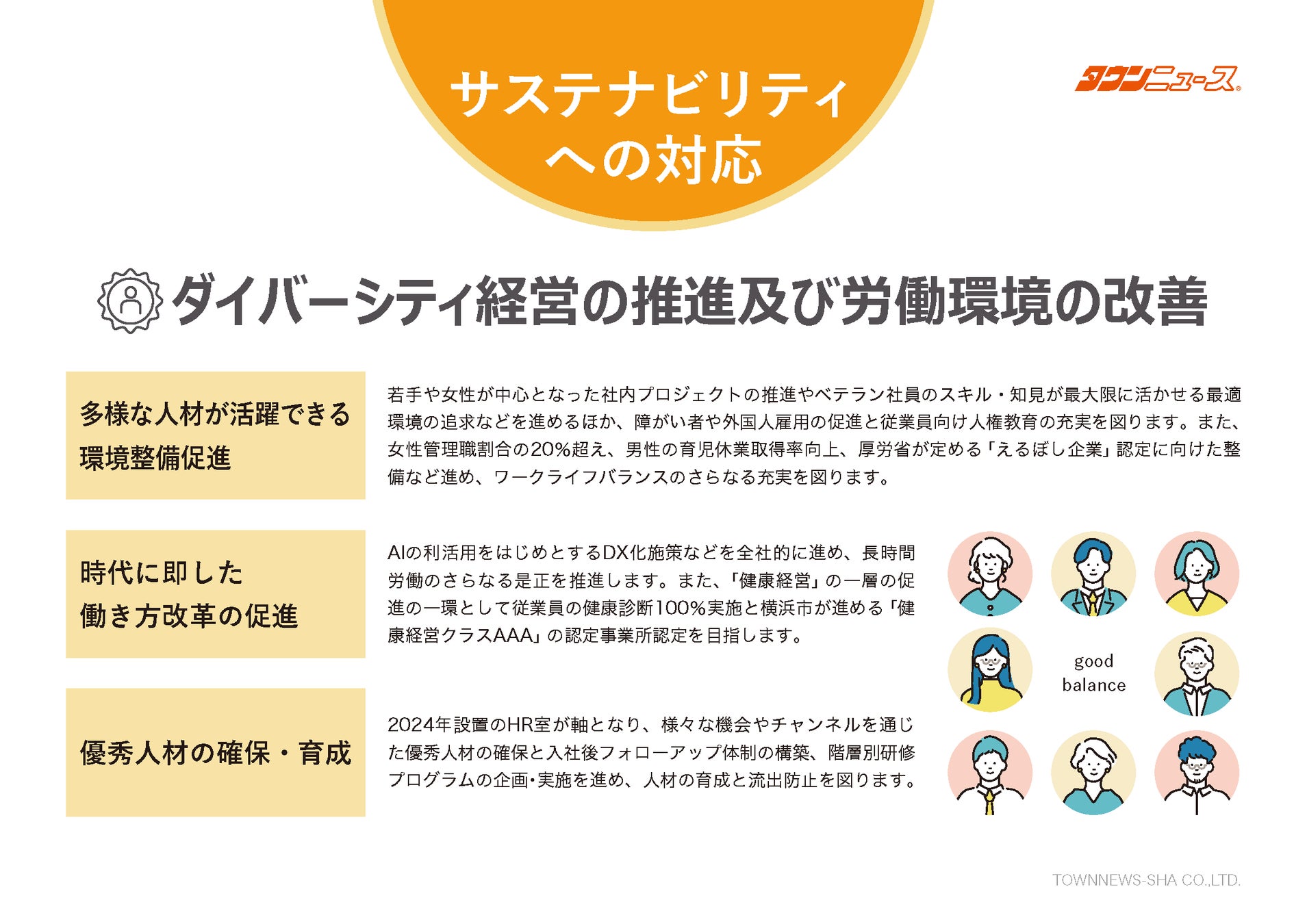 ダイバシティ―経営の推進などを進めるとともに、「社会的課題解決へのアプローチ」事業の展開で地域社会の持続可能な発展とSDGsの実現に貢献します。