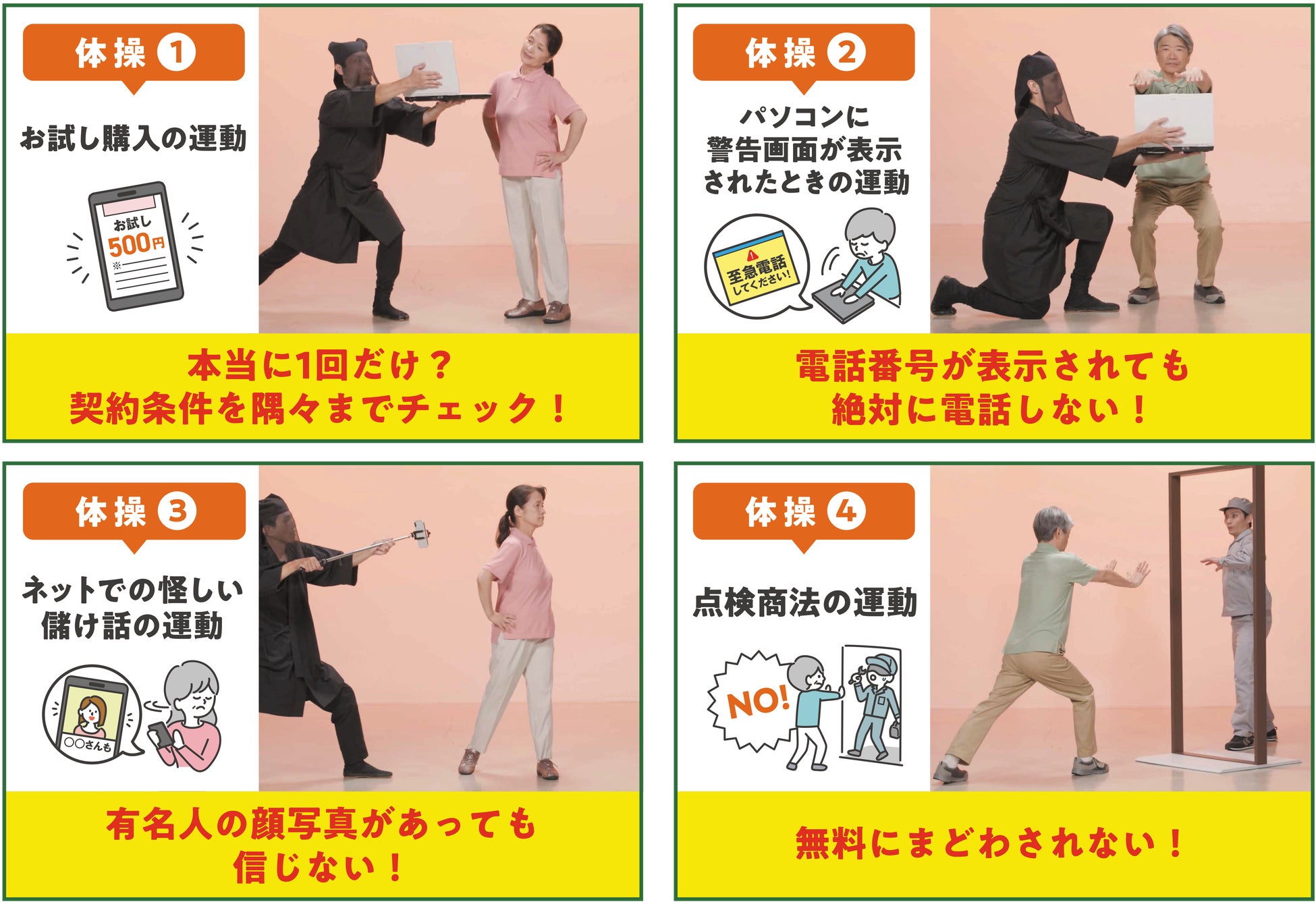 「カラダで覚える!消費者トラブル回避体操」は、60代・70代からの相談が多い【お試し購入のトラブル】・【セキュリティサポートのトラブル】・【点検商法のトラブル】・【ネットでの怪しい儲け話のトラブル】の事例をもとに体操を考案。「消費者トラブルは、知識と体操で回避しよう」をテーマに、高齢者の方々が消費者トラブルについて学ぶだけでなく、近隣のコミュニティなどにおいても体操を通してコミュニケーションを図ることで、高齢者が抱える「お金・健康・孤独」の不安の解消も目指します。