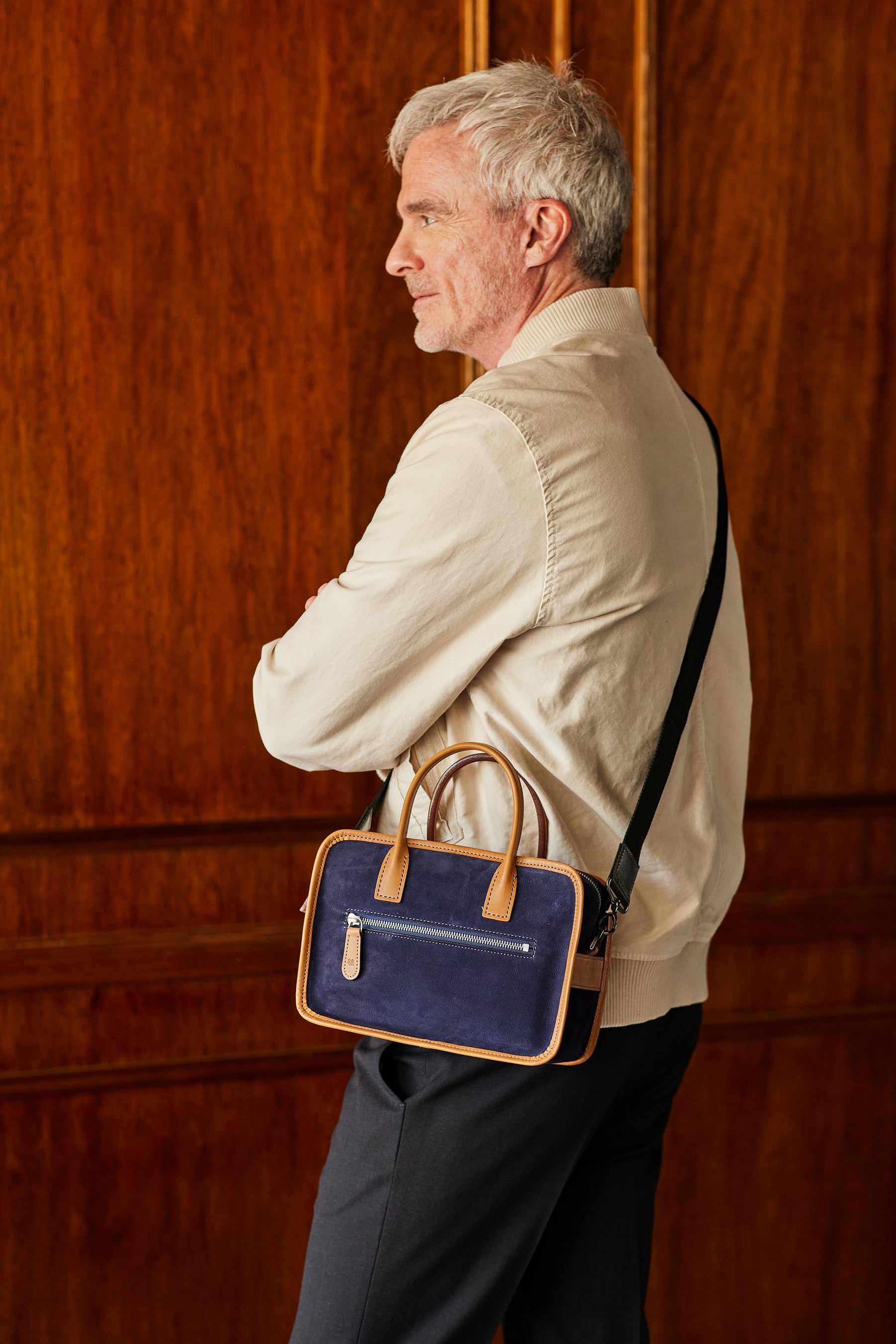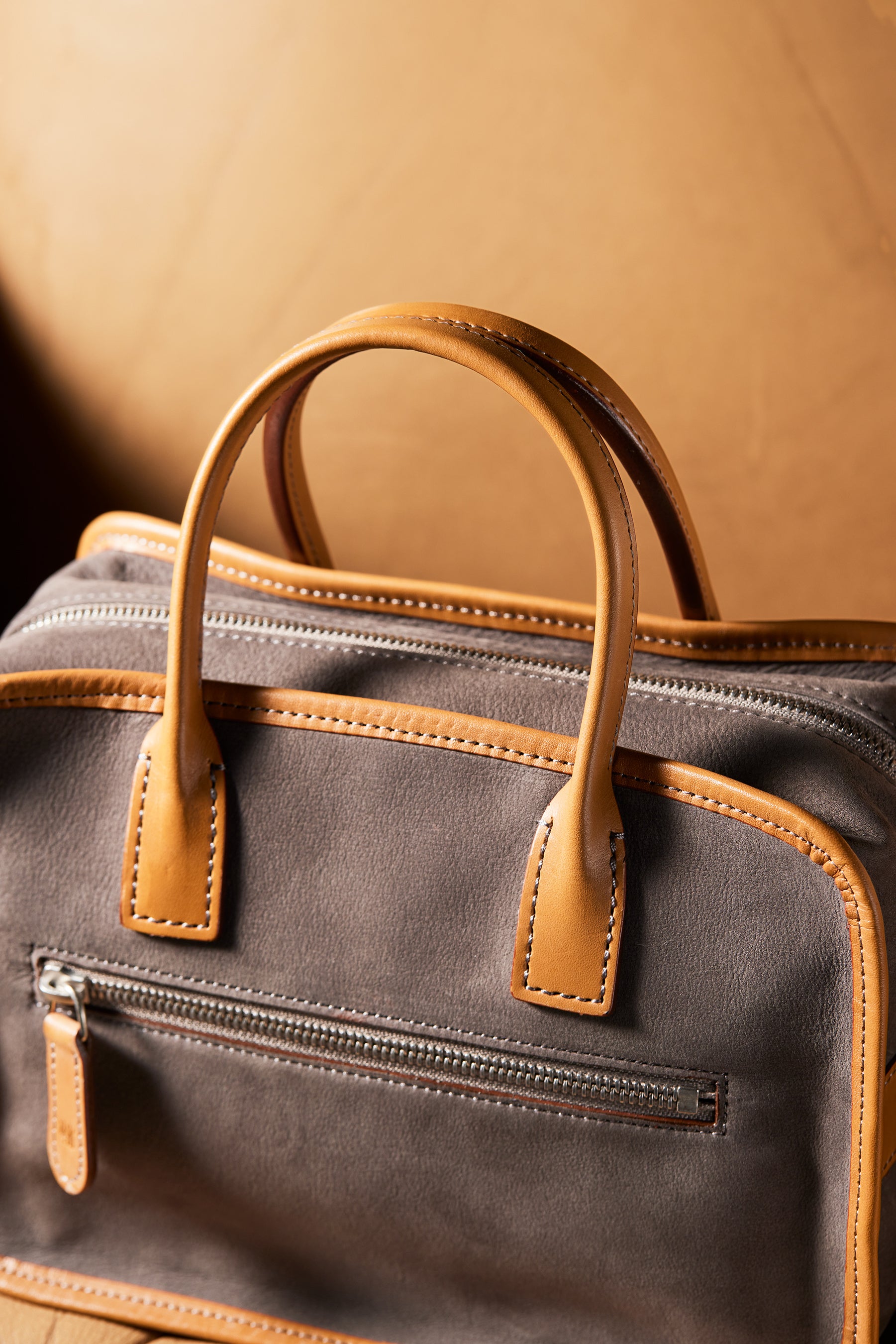 ボディのヌバックレザーと英国オークバークレザーの組み合わせがお洒落な外装。細かい部分まで丁寧に仕立てています。硬派なビジネス鞄の熟練工が仕立てる事により、お洒落な雰囲気がありながらも、その鞄が手仕事で作られている事が伝わっていきます。男に似合うショルダーボストンとしてショルダーは黒色に、金具も黒色にしてシックに引き締まっています。
