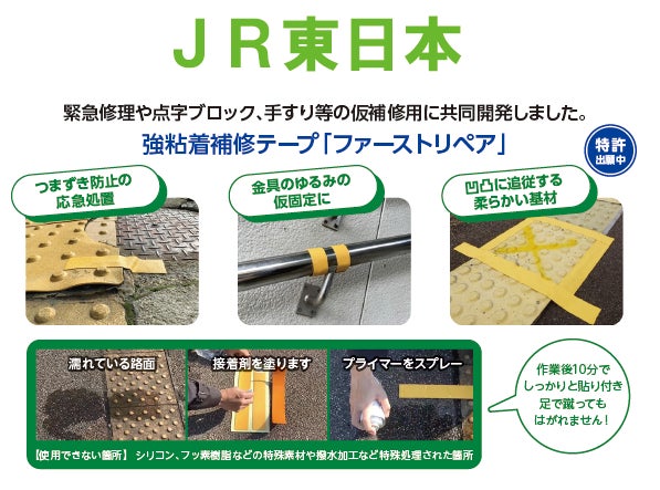 各種緊急修理や点字ブロック、手すり等の仮補修用に共同開発いたしました。緊急を要する修理は天候や環境を問わずに実施される為、様々な環境下にてしっかりと貼り付けるニーズに対応しました。展示ブース内では開発担当者のご案内とともに実際にお手に取ってご覧いただけます。