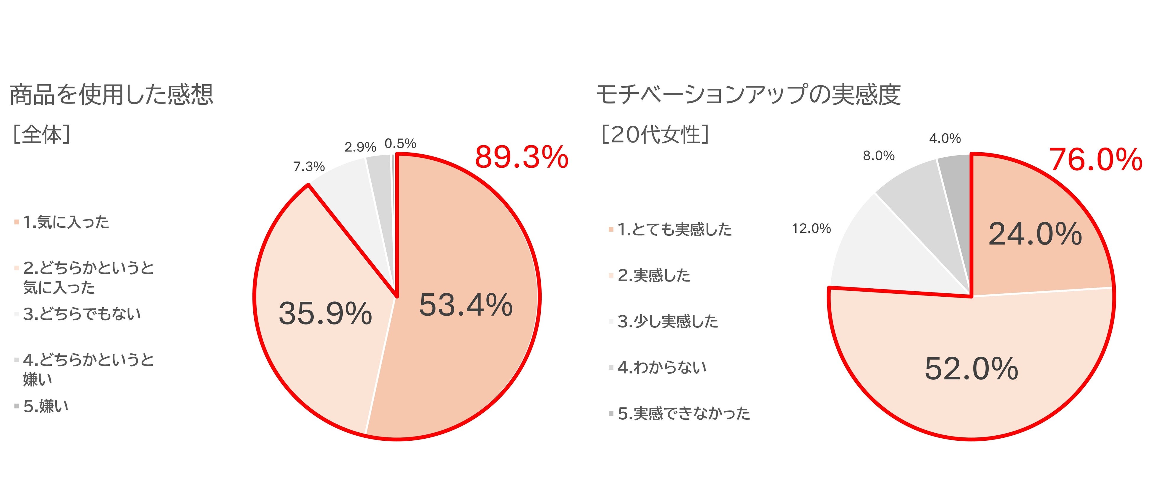 中でも、20代女性においては96.0%の方が「気に入った」「どちらかというと気に入った」と回答され、76.0%がモチベーションアップを「とても実感した」「実感した」と回答されました。