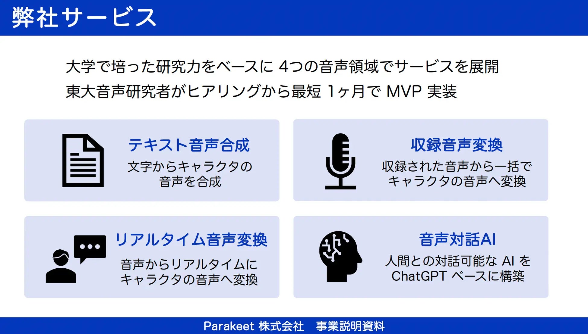 Parakeet株式会社は、音声合成技術を専門とする研究者で構成されており、「音声合成AIに特化した能力密度が極めて高い研究者集団」です。ミッションである "2030年までに、「世界で最も傑出した音声合成技術を持つ会社」という評価を確立する" を目指し、スマートフォンでも動作する次世代リアルタイムAIボイスチェンジャー「Paravo(パラボ)」、高速に動作するテキスト音声合成ソフトウェア「Paratts(パラッツ)」を個人・法人展開しております。