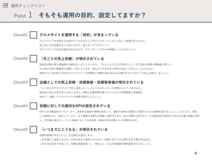 この資料では、グルメサイトを運用するうえでの意識するチェックリストを作成しました。