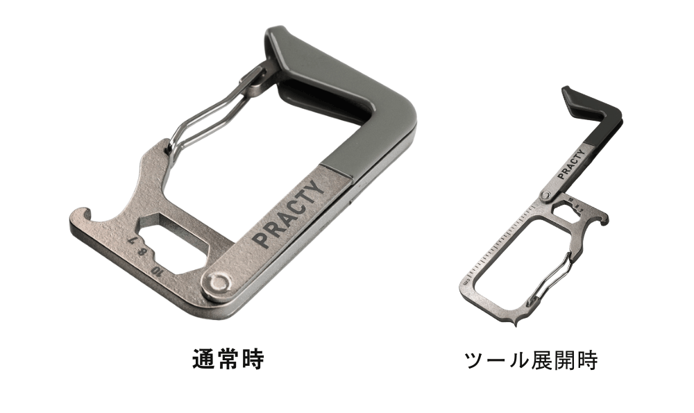 普段はカラビナとして。必要な時に、ダンボールカッターをはじめ、レンチ・定規・ボトルオープナー・ドライバーなど、日常で役立つ機能を使えます。