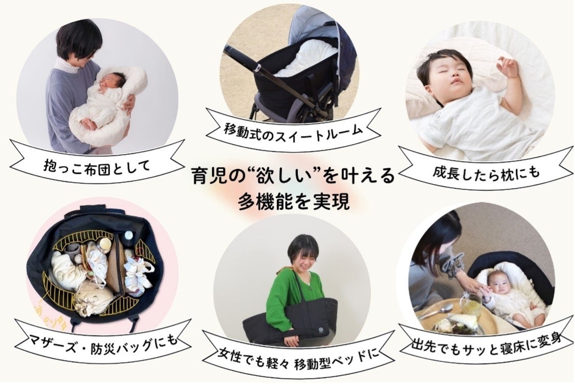 主な機能は、「抱っこ布団」「移動型ベッド」「お昼寝マット、枕」「マザーズバッグ」「防災バッグ」など。