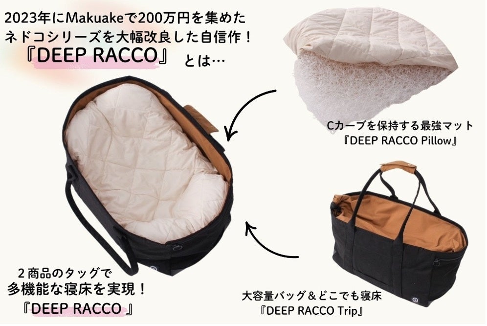 『DEEP RACCO』とは、Makuakeで約200万円を集めた大人気ネドコシリーズを大幅に改良した自信作です。