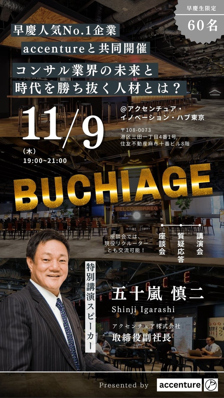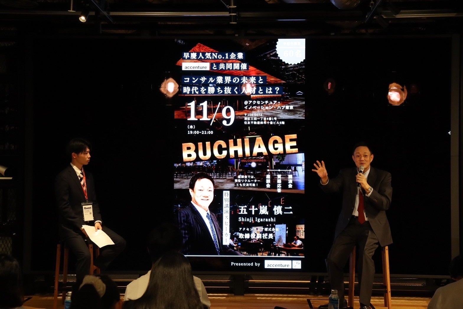 「BUCHIAGE」は、Percify株式会社が毎月開催している早慶東大生向けのキャリアイベントです。11月のBUCHIAGEでは、アクセンチュア株式会社の取締役副社長・五十嵐慎二様にお越しいただき、参加学生たちに貴重な時間を提供することができました。