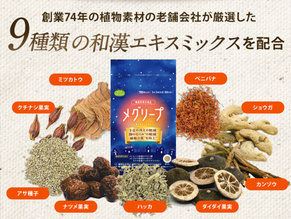 創業74年の植物素材の老舗原料メーカーが厳選した9種類の和漢エキスミックスを配合しました。