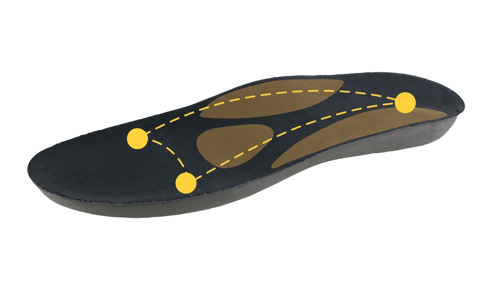 足を支え、心地よいフィット感を生み出す程よい硬さのEVA素材を使用。ヒールクッションがかかとへの衝撃を和らげ、3つのアーチフィッティングを一層上げる効果をもたらします。