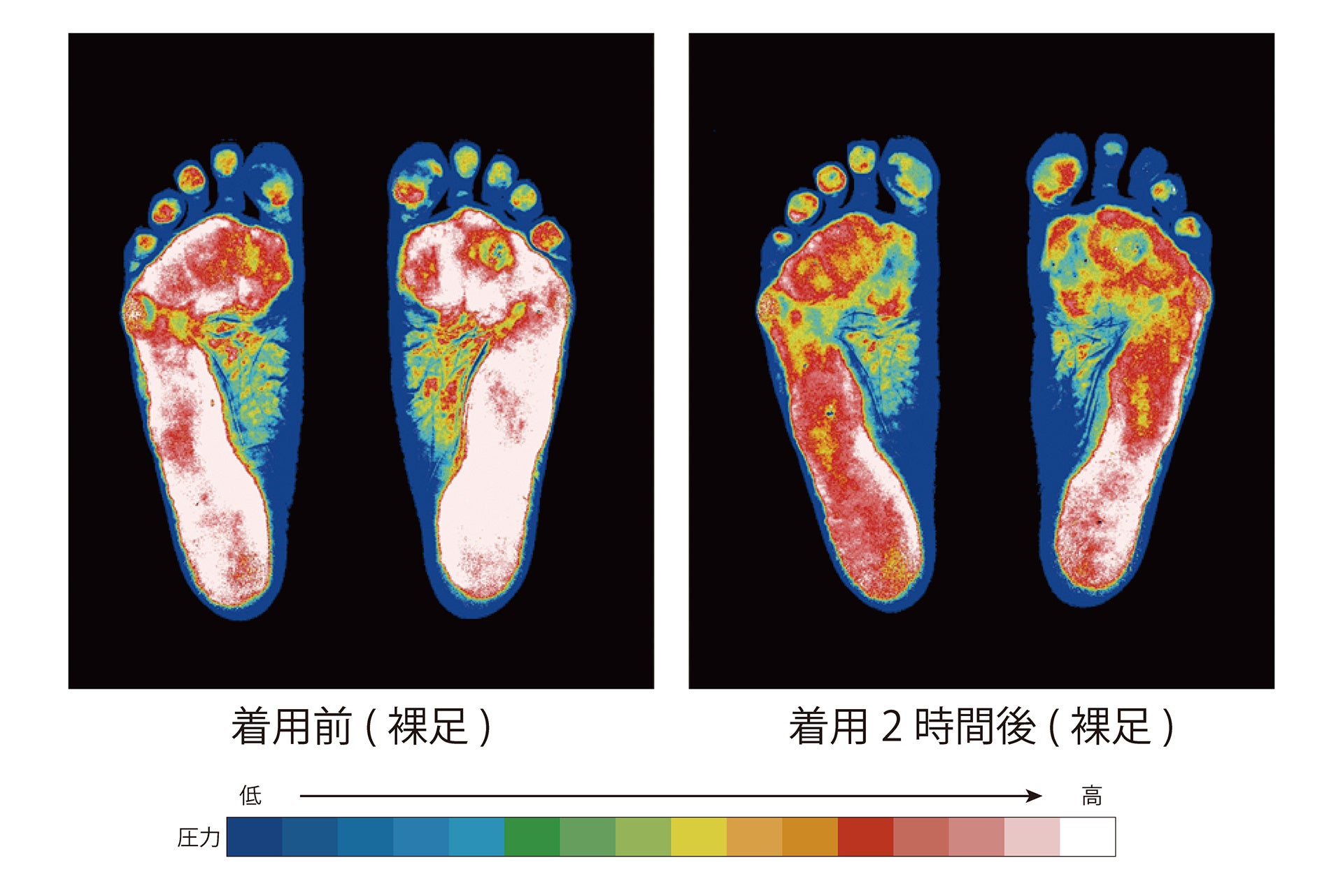 着用前は足全体、特に土踏まず部分に体重がかかっていたが、KEEPFITインソール着用2時間後、土踏まず部分の圧力が減り、足本来の自然なに形に整えられています。