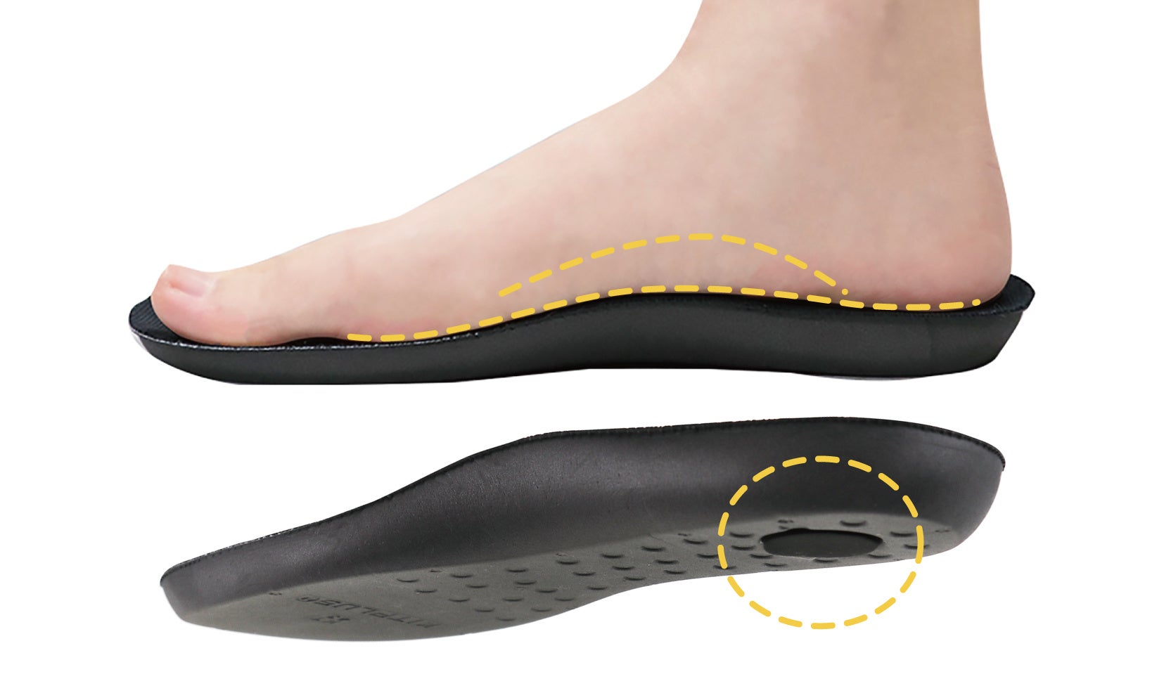 整骨院監修の解剖学に基づき成形した凹凸が足にフィットすることで、お椀上に足裏全体を支える構造を作り、足本来の自然な形を引き出します。