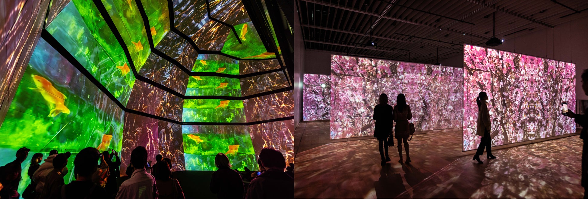大きな人気を呼んでいる本展では、「華やかで神秘的な非日常空間に没入できる」「作品に飛び込んだような体験ができる」「夜景に溶け込む映像インスタレーションが美しい」などの声が寄せられており、平日でも多くのお客様がご来場されています。本展は、昼夜で演出が異なる作品や会期から徐々に朽ちていく生花の展示、そのプロセスを記録していく写真の展示空間など、常に変化し続ける作品もあり、何度来ても楽しめる展覧会となっておりますので、まだご来場されたことがない方はもちろんのこと、一度ご来場された方も会期中にぜひ何度もお越しください。