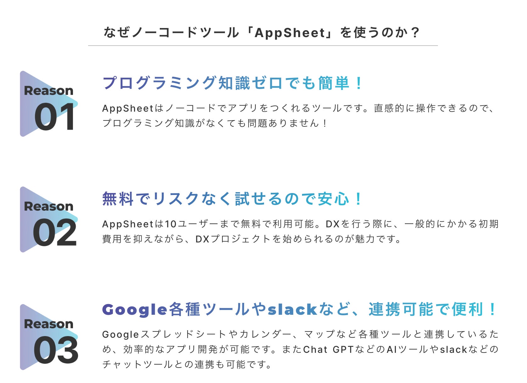 AppSheetはノーコードでアプリをつくれるツールで、直感的な操作が可能。ですので、プログラミング知識がなくても簡単に扱えるようになります。