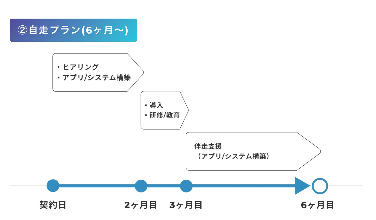 ゆくゆくは社内でアプリ開発をしていきたい企業におすすめのプラン。3ヶ月間で1つ目のアプリが完成した後に、3ヶ月間の伴走期間を設け、アプリ開発の方法をレクチャーします。常にサポート体制は整えておりますし、場合によっては期間の延長も可能ですので、ご安心ください。