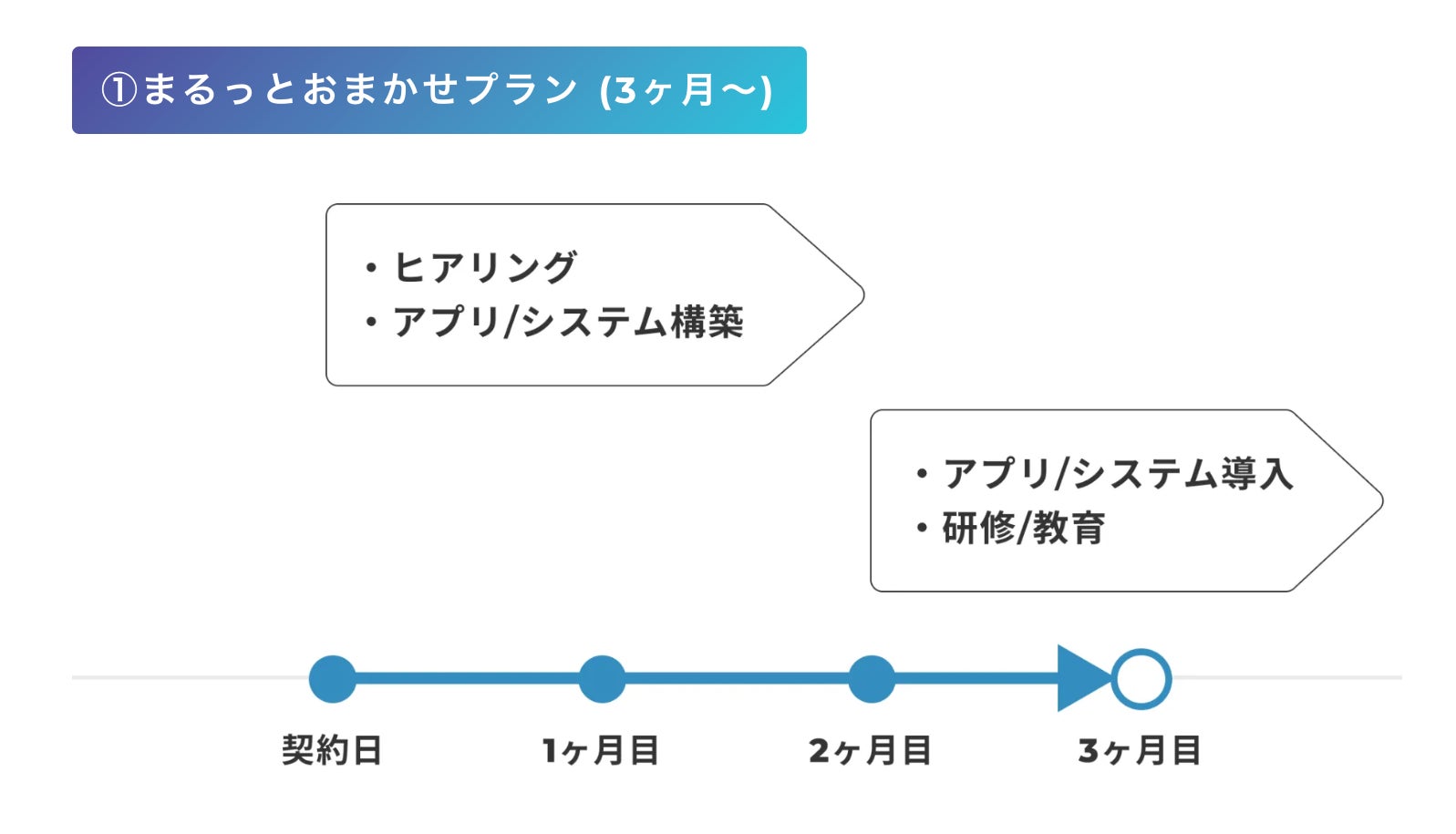 ITの知識や経験のある人材がいない企業におすすめのプラン。アプリ開発はまるっと私たちにおまかせください。システム構築が完了したら、アプリの操作方法をレクチャーします。