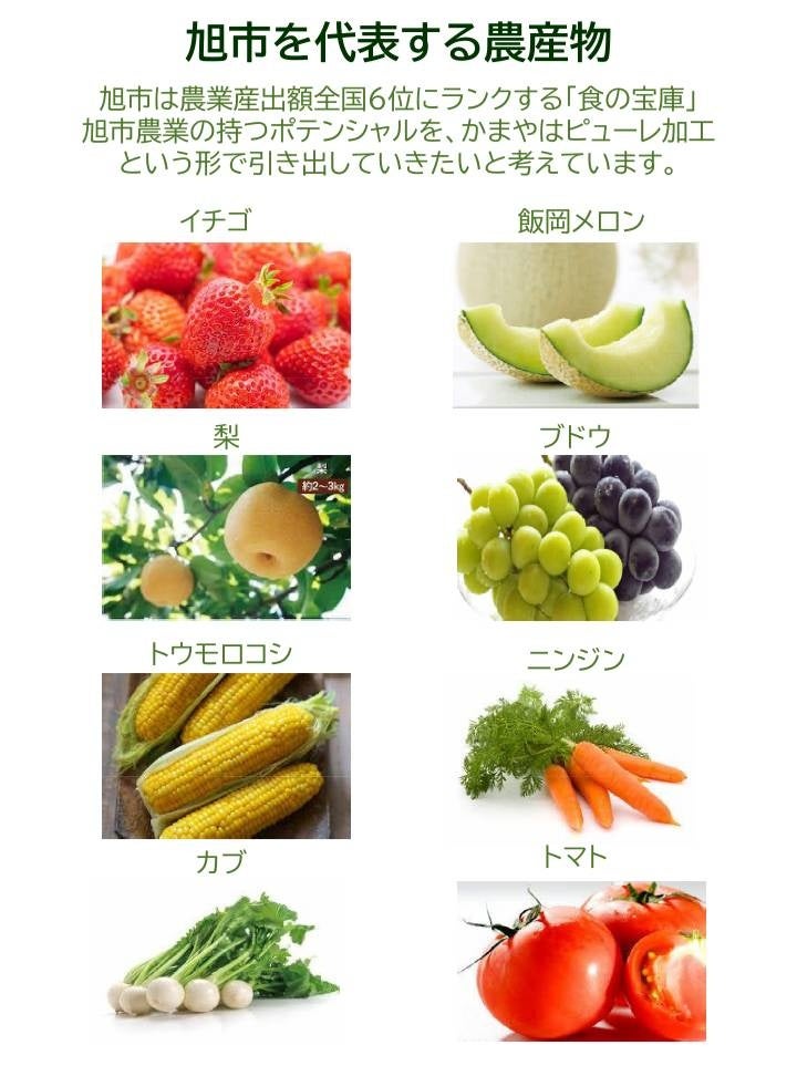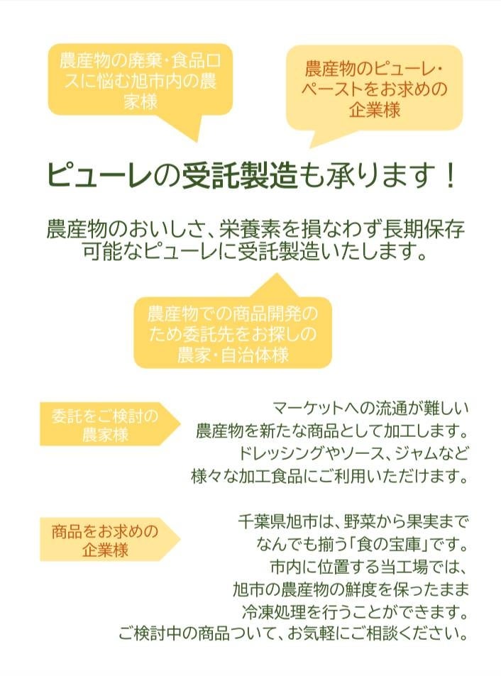 千葉県旭市は、温暖な気候に恵まれサンチュ以外にも沢山の野菜や果物の生産が盛んな地域です。収穫が間に合わず余剰になってしまった野菜や、傷がついてしまい出荷基準に満たない果物を、弊社でピューレ加工することができます。原料としてのピューレ加工はもちろん、離乳食や介護食だけでなく、調味料を加えたり野菜を組み合わせたりすることでスムージーやスープ、ドレッシング、ソースなどのオリジナル製品の開発をすることで利用シーンが広がります。質の良い農作物を、あまさずお客様の価値に変えることで新たな需要に対応することが可能です。
