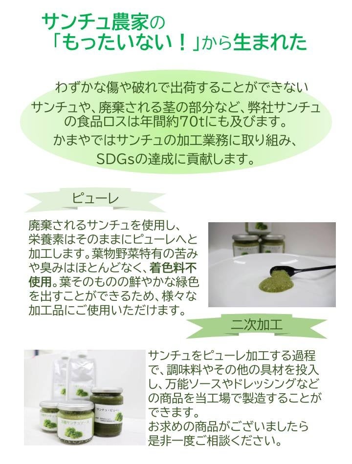 この度、お客様に美味しい野菜を届けられなかった痛みから、長持ちする加工食品の開発・生産体制を整えました。栽培~収穫~加工まで自社で一貫することで、新鮮な状態のサンチュをピューレ加工することが可能であると同時に、競争力のある価格を実現します。