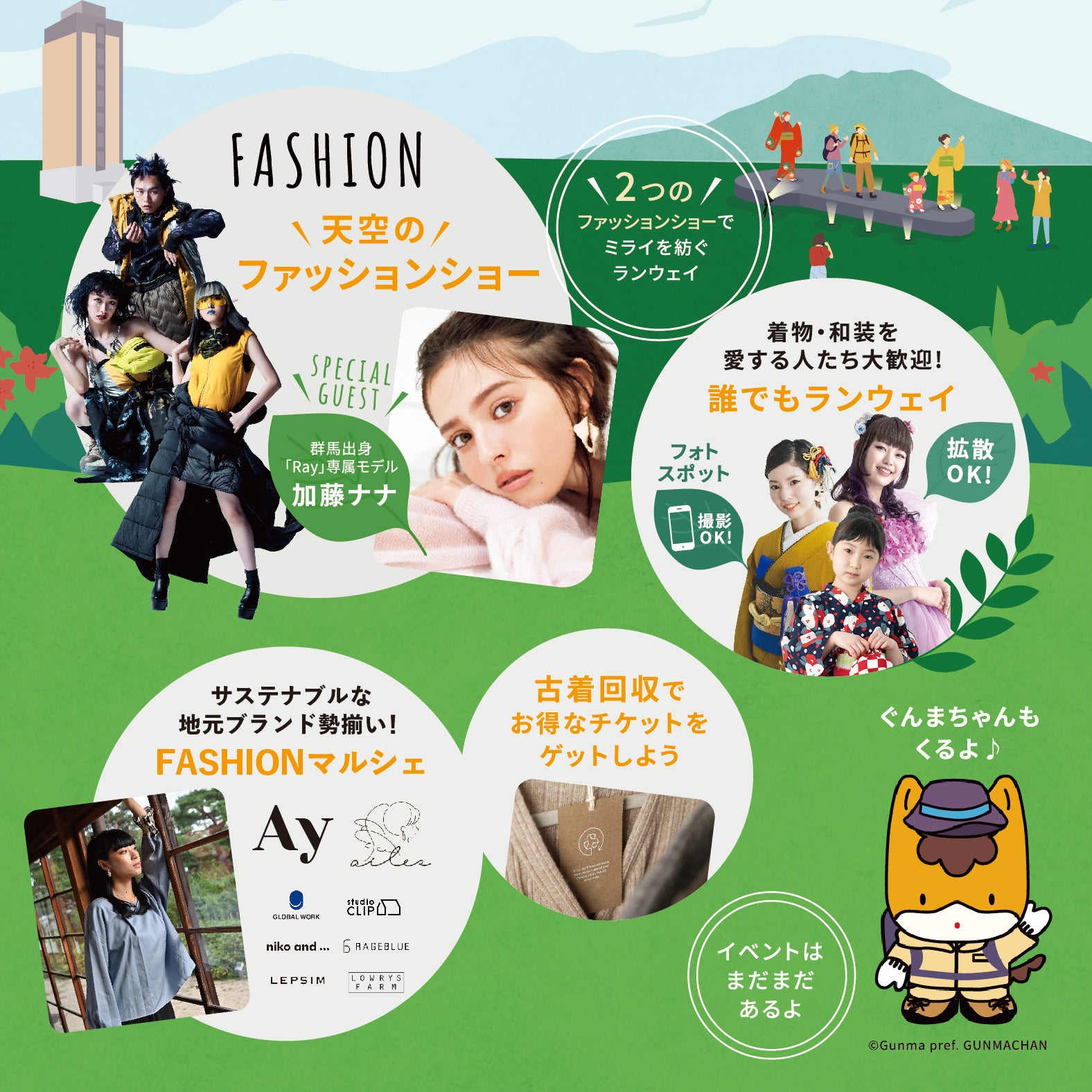 天空のファッションショーには、モデルの加藤ナナさんをゲストに迎え、県内繊維産業のサステナブルな最新ファッションでモデルがランウェイを歩く姿を間近に見学できます。