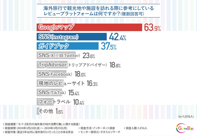 「海外旅行で観光地や施設を訪れる際に参考にしているレビュープラットフォームは何ですか?(複数回答可)」と質問したところ、『Googleマップ(63.9%)』と回答した方が最も多く、次いで『SNS(Instagram)(42.4%)』『ガイドブック(37.5%)』と続きました。