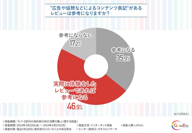 「"広告や協賛などによるコンテンツ表記"があるレビューは参考になりますか?」と質問したところ、約半数の方が『実際に体験をしたレビューであれば参考になる(46.9%)』と回答しました。