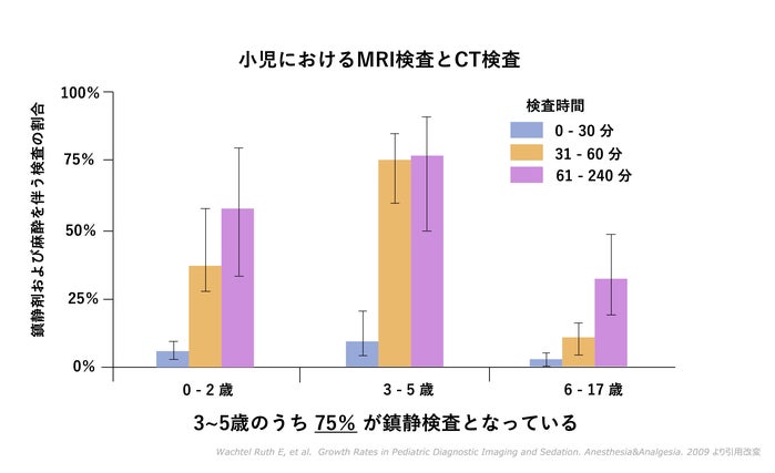 MRI検査に関するこれまでの報告によると、MRI検査やCT検査を完了するために大部分の子ども(25〜45%)が鎮静または全身麻酔を受けており、その数は3〜5歳の子どもでは75%となっています。