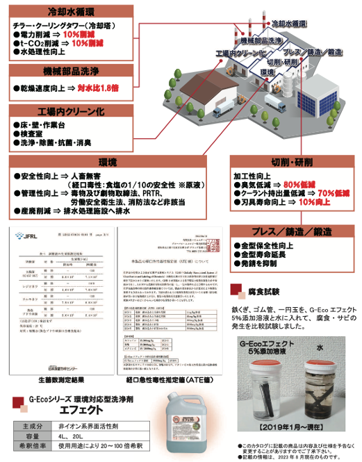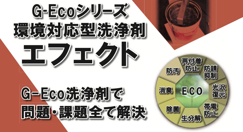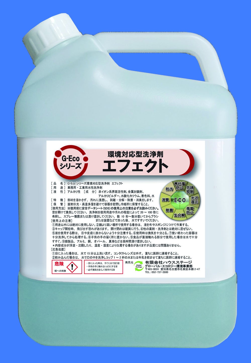 弊社は環境にやさしく動植物にもやさしい、環境対応型洗浄剤、防カビ・防菌剤、コーティング剤、消臭剤などの環境関連製品の企画・販売・施工を中心に、環境対応型特殊洗浄G-Eco工法の企画・販売・施工をおこなっております。その中でこの度、旧製品よりもさらに洗浄力が向上したG-Ecoシリーズ環境対応型洗浄剤「エフェクト」の販売を開始しました。本商品は、弊社独自の研究・開発技術により、環境に負担をかけない水系でありながら高い洗浄力を実現しました。工場や店舗のあらゆる汚れを落とすことで、工場が本来持っている生産性の改善やコスト削減に貢献します。