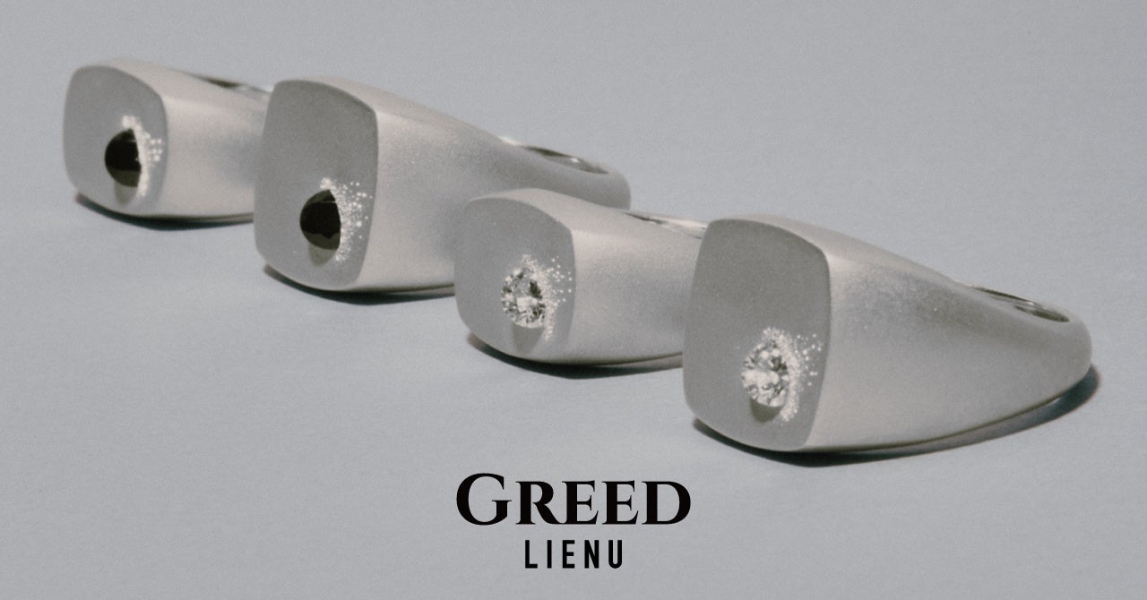 LIENU(デザイナー:當山莉奈)は、宝石を斜めに埋め込んだデザインの「GREED」シリーズを発表。展示・先行受注販売会を9月27日~29日にMIDORI.so BAKUROYOKOYAMAで開催。